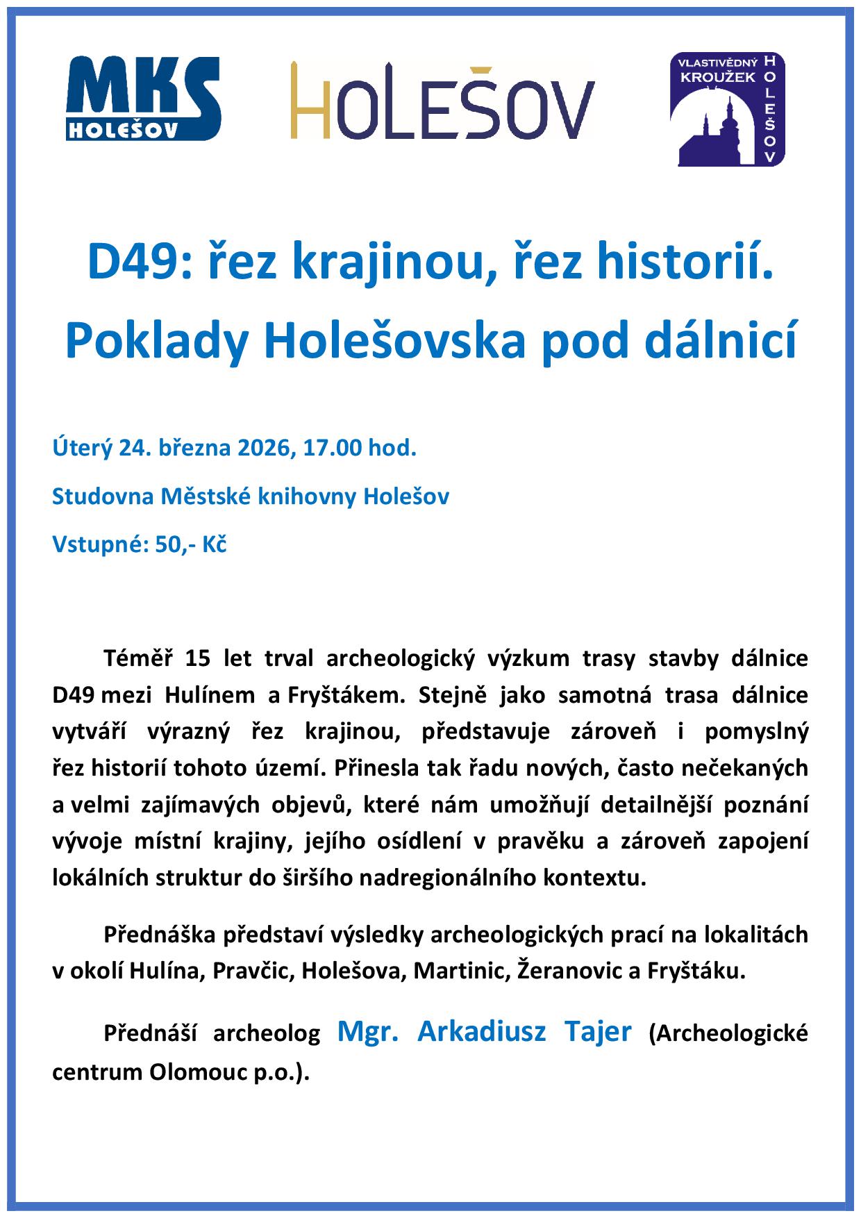 Téměř patnáct let probíhal archeologický výzkum na trase budované dálnice D49 mezi Hulínem a Fryštákem. Stejně jako samotná stavba vytváří výrazný řez krajinou, znamenal tento projekt i jedinečný "řez historií" území Holešovska. Výzkum přinesl řadu nových, často překvapivých a velmi cenných objevů, které výrazně rozšiřují naše poznání vývoje místní krajiny i jejího osídlení od pravěku až po novější období.