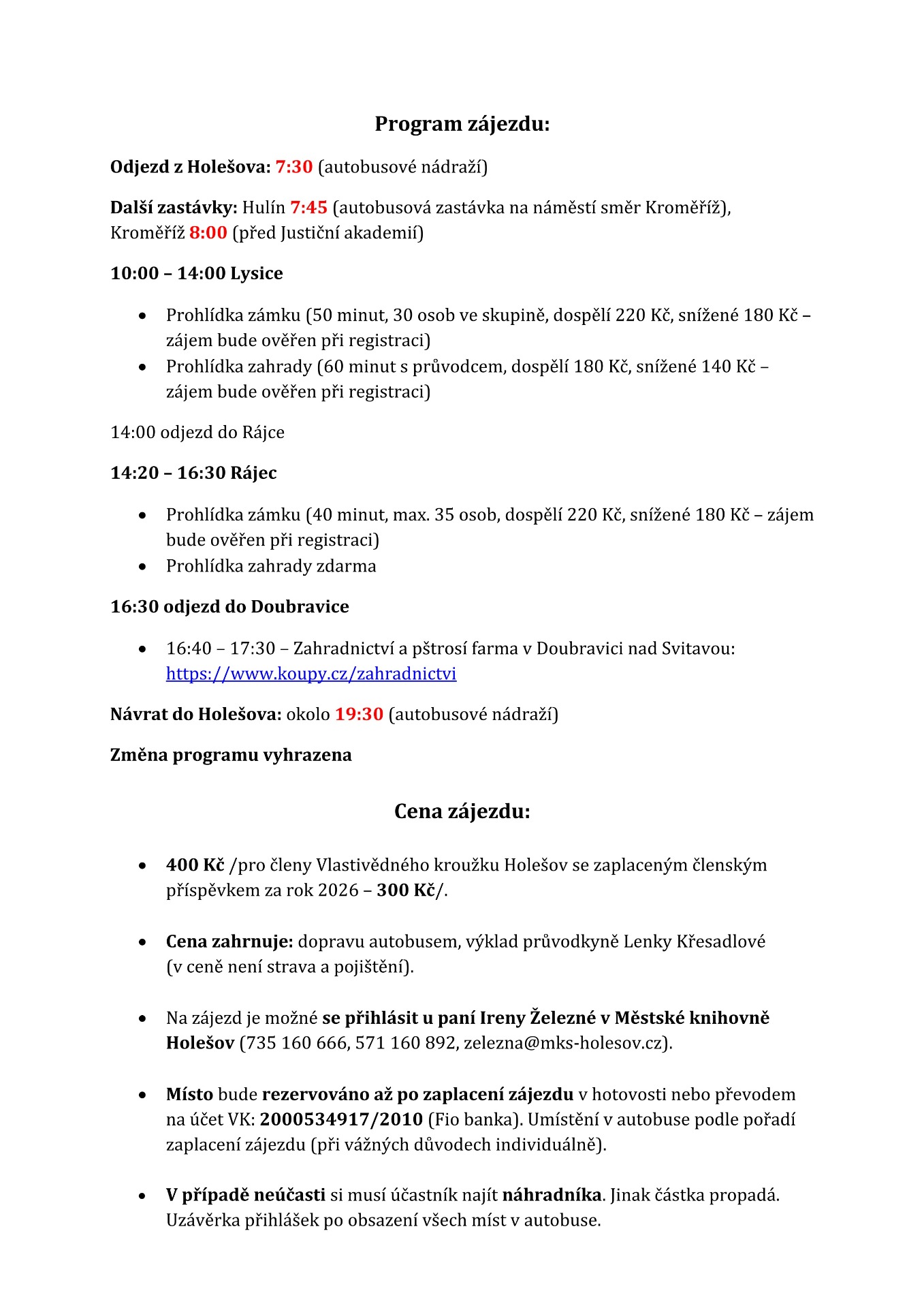 300 Kč / člen Vlastivědného kroužku Holešov (se zaplaceným členským příspěvkem na rok 2026)