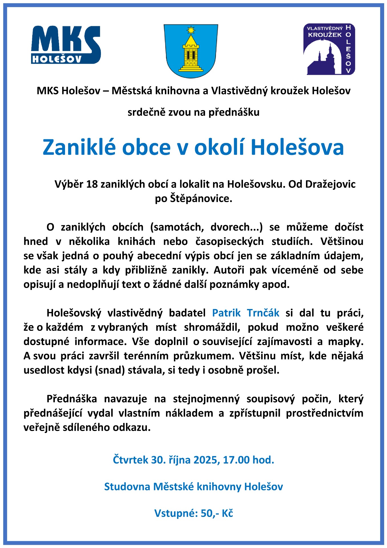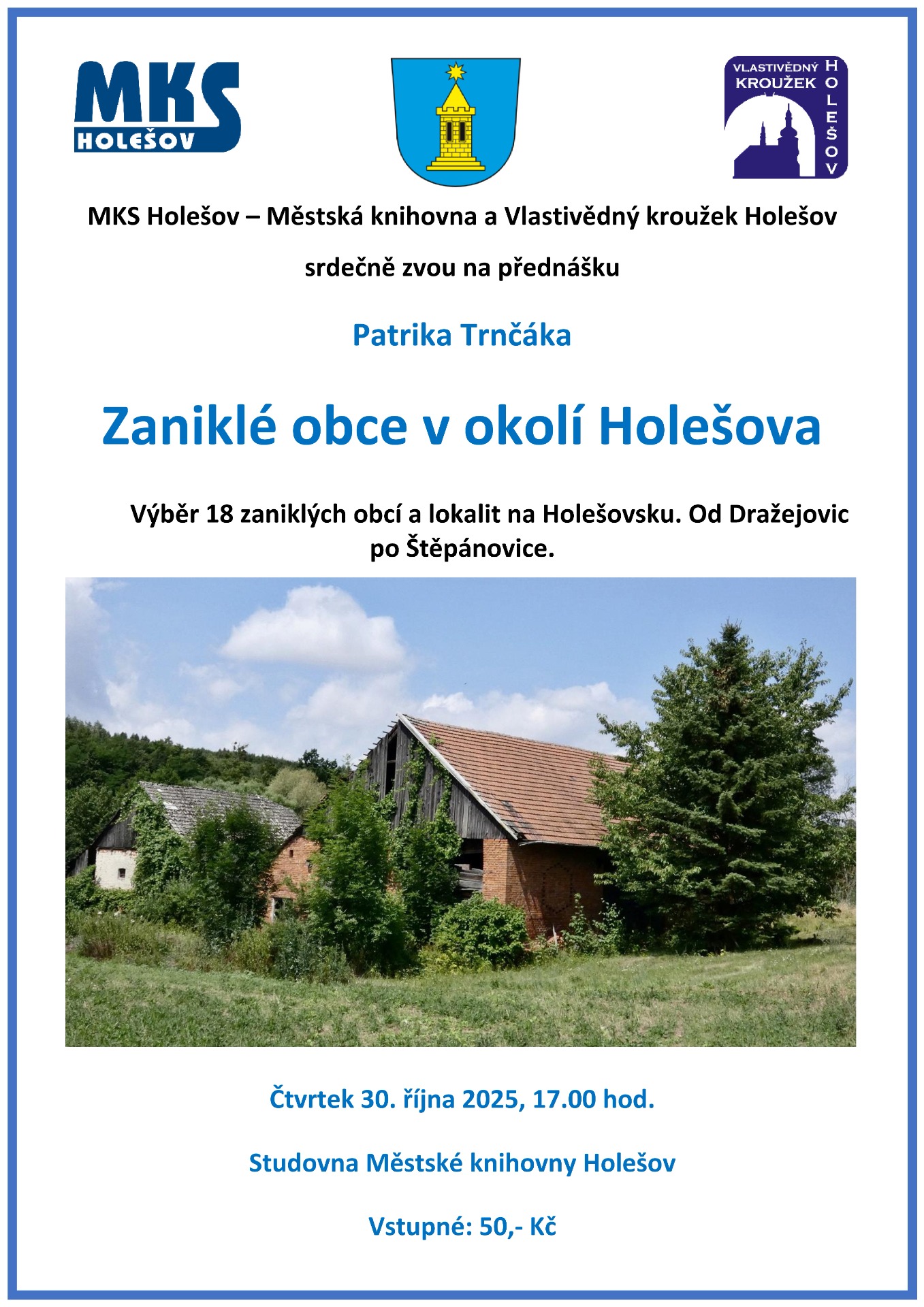 Přednáška navazuje na stejnojmenný soupisový počin, který přednášející vydal vlastním nákladem a zpřístupnil prostřednictvím veřejně sdíleného odkazu ( https://alien-mastermynd.com/obce/zanikle_obce_2025.pdf ).